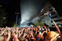 Jake Owen keeps the crowd rowdy during his Beach Party. The event was held in BMI Nashville’s back lot. View Photo