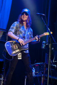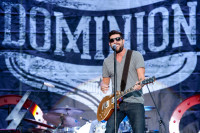 Jaren Johnson, of The Cadillac Three, flashes a grin during his band’s set before Jake Owen takes the stage. View Photo