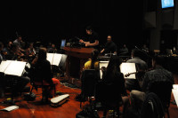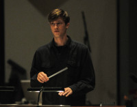 Composer Robert Lydecker steps up to the platform for his turn to conduct. View Photo