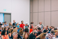 The line extends out the door during the audience Q&A portion of “I Love That Song: Composing, Scoring and Singing Superhero Style.” View Photo
