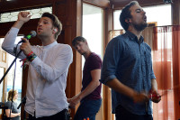 The Electric Sons, made up of (L-R) BMI songwriter Benjamin Richards, Andrew Miller and Chris Zeigler pose before their performance at AthFest. The electro-indie-pop group is based in Atlanta, Georgia, and is working on a debut EP. View Photo