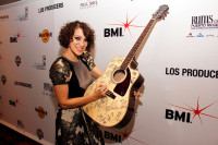 Gaby Moreno firma una guitarra en el Show de Beneficencia de BMI y Los Producers, uno de los objetos que son parte de la subasta que beneficia a Education Through Music - Los Angeles. View Photo