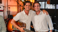 BMI songwriter Steve Moakler poses with BMI’s Jackson Kiger after receiving a custom Taylor 210e DLX guitar in celebration of co-writing his first No. One hit Jordan Davis’ “I Ain’t Sayin’.” View Photo