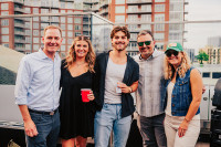 Delta’s Charlie Schewe, Delta’s Maddie Marrott, Winner Matt Oakley, BMI’s Mason Hunter and BMI’s Nina Carter pose after Delta Air Lines’ giveaway for two first-class round-trip tickets at BMI’s Rooftop On The Row. View Photo