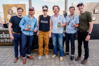 Briscoe and bandmates pose with George Dickel’s Amy Van Buren after tasting product at BMI’s Rooftop On The Row kickoff to AMERICANAFEST. View Photo