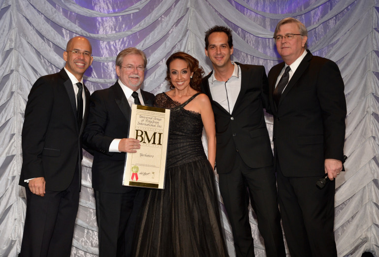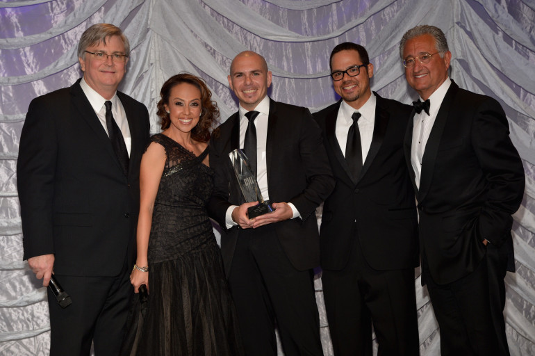Phil Graham, BMI Senior Vice President, Writer/Publisher Relations; Delia Orjuela, BMI Vice President, Writer/Publisher Relations, Latin; BMI President's Award recipient Armando "Pitbull" Perez; BMI's Joey Mercado and BMI President & CEO Del Bryant pose onstage during the 19th Annual BMI Latin Music Awards at the Encore Wynn Las Vegas on March 30, 2012 in Las Vegas, Nevada.