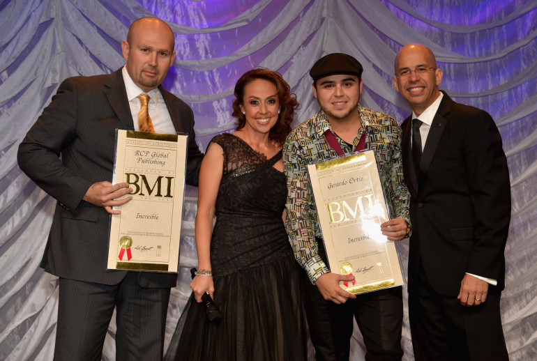 BMI Latin Award winner Fernando Camacho; Delia Orjuela, BMI Vice President, Writer/Publisher Relations, Latin; BMI Latin Award winner Gerardo Ortiz and Porfirio Piña, BMI Senior Director, Writer/Publisher Relations, Latin pose onstage during the 19th Annual BMI Latin Music Awards at the Encore Wynn Las Vegas on March 30, 2012 in Las Vegas, Nevada.