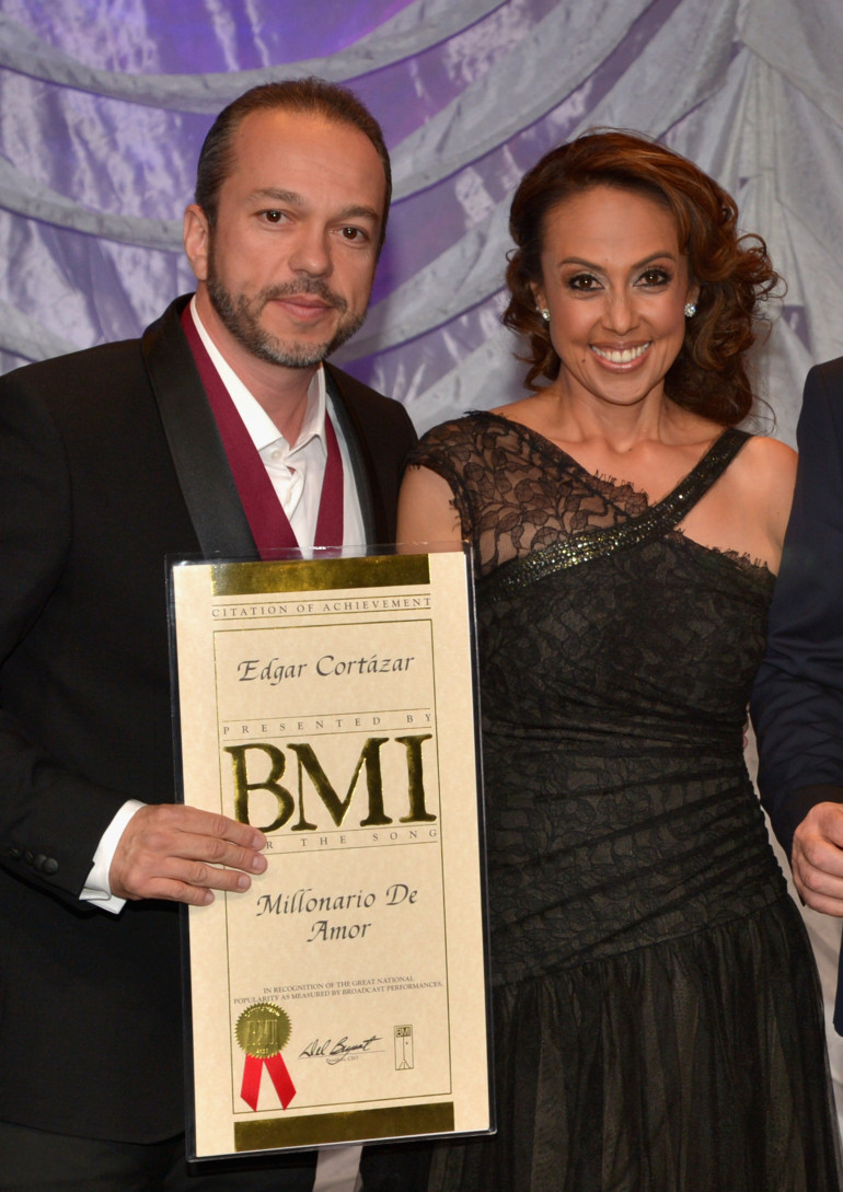 BMI Latin Award winner Edgar Cortazar and Delia Orjuela, BMI Vice President, Writer/Publisher Relations, Latin, pose onstage during the 19th Annual BMI Latin Music Awards at the Encore Wynn Las Vegas on March 30, 2012 in Las Vegas, Nevada.