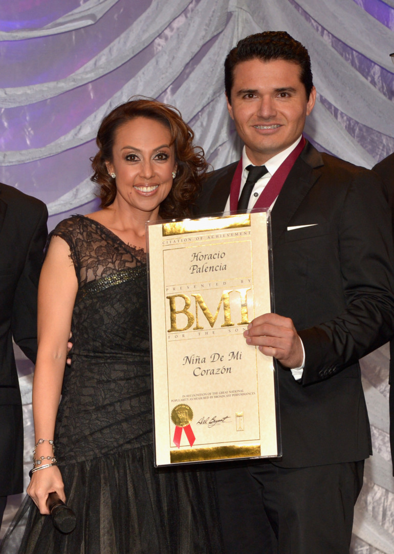 BMI Vice President Latin Writer/Publisher Relations Los Angeles Delia Orjuela and BMI Latin Best Song of the Year Award Horacio Palencia pose onstage during the 19th Annual BMI Latin Music Awards at the Encore Wynn Las Vegas on March 30, 2012 in Las Vegas, Nevada.