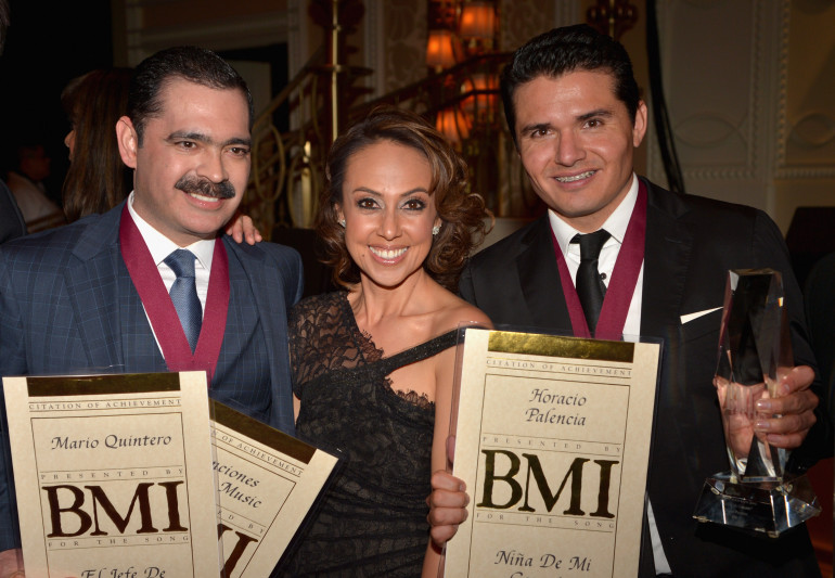 Multiple BMI Latin Award winner Mario Quintero; Delia Orjuela, BMI Vice President, Writer/Publisher Relations, Latin; and BMI Latin Song of the Year Award winner Horacio Palencia celebrate at the 19th Annual BMI Latin Music Awards at the Encore Wynn Las Vegas on March 30, 2012 in Las Vegas, Nevada.
