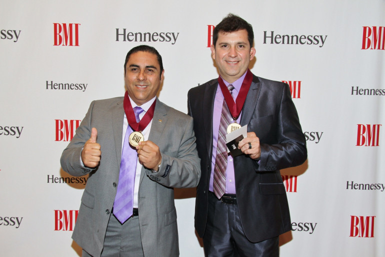 BMI Latin Award winner Clinton Sparks and BMI President's Award recipient Armando "Pitbull" Perez pose onstage during the 19th Annual BMI Latin Music Awards at the Encore Wynn Las Vegas on March 30, 2012 in Las Vegas, Nevada.