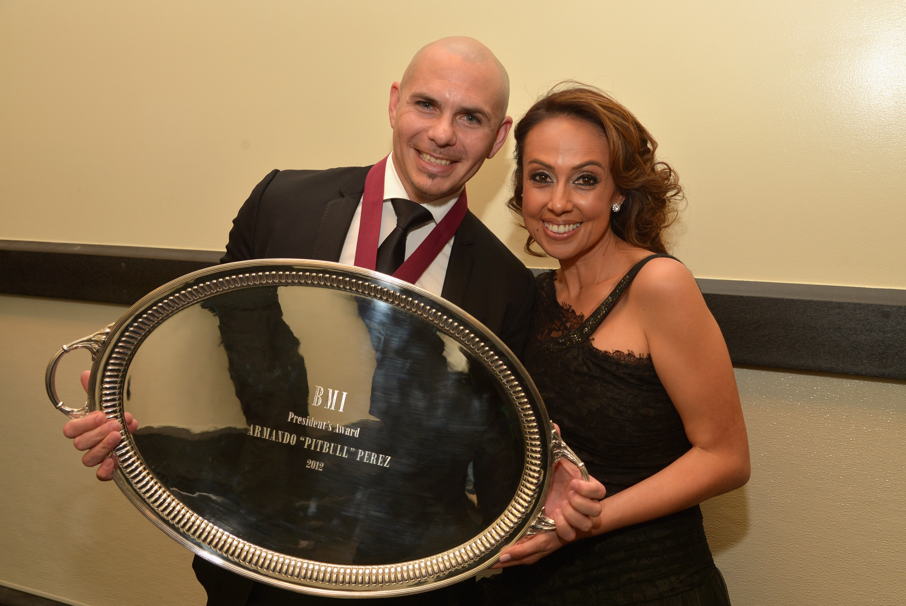 BMI Latin Award recipient Armando "Pitbull" Christian Perez and Delia Orjuela, BMI Vice President Latin Writer/Publisher Relations, enjoy the 19th Annual BMI Latin Music Awards at the Encore Wynn Las Vegas on March 30, 2012 in Las Vegas, Nevada.