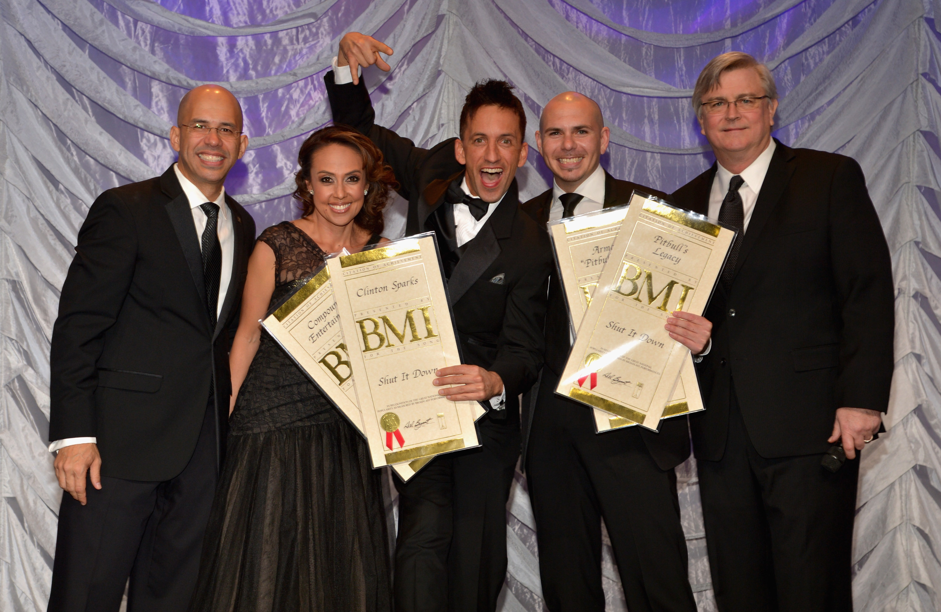 Porfirio Piña, BMI Senior Director, Writer/Publisher Relations; Delia Orjuela, BMI Vice President, Writer/Publisher Relations, Latin; BMI Latin Award winner Clinton Sparks, BMI President's Award recipient Armando "Pitbull" Perez and BMI Senior Vice President, Writer/Publisher Relations Phil Graham pose onstage during the 19th Annual BMI Latin Music Awards at Encore Wynn Las Vegas on March 30, 2012 in Las Vegas, Nevada.