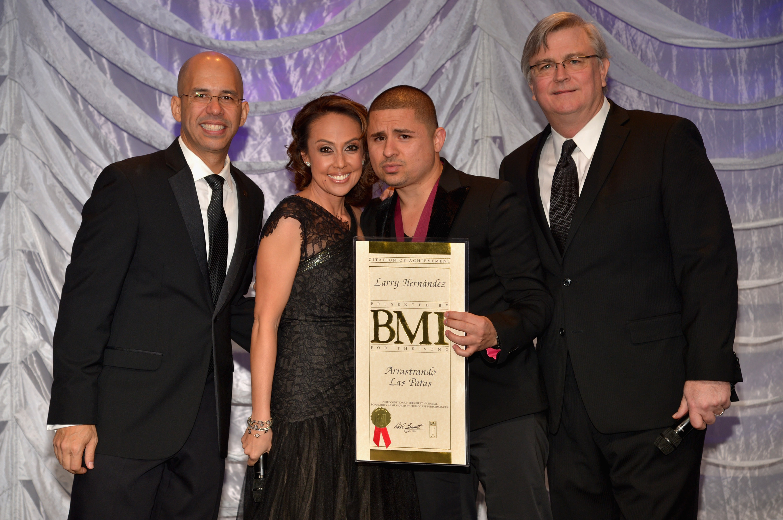 Porfirio Piña, BMI Senior Director, Writer/Publisher Relations, Latin; Delia Orjuela, BMI Vice President Writer/Publisher Relations, Latin; BMI Latin Award winner Larry Hernandez and BMI Senior Vice President, Writer/Publisher Relations Phil Graham pose onstage during the 19th Annual BMI Latin Music Awards at the Encore Wynn Las Vegas on March 30, 2012 in Las Vegas, Nevada.