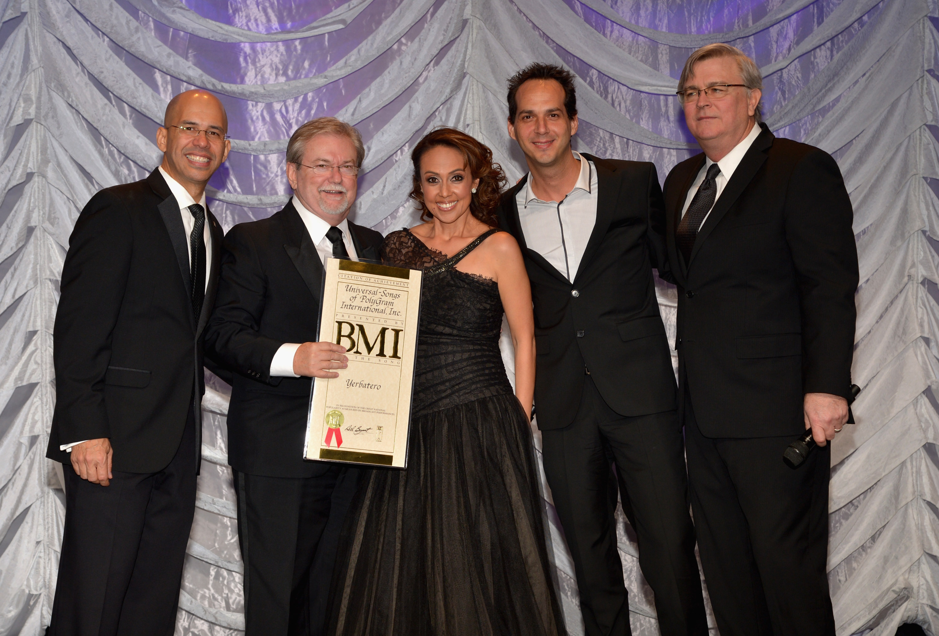 Phil Graham, BMI Senior Vice President, Writer/Publisher Relations; Delia Orjuela, BMI Vice President, Writer/Publisher Relations, Latin; BMI President's Award recipient Armando "Pitbull" Perez, BMI's Joey Mercado and BMI President & CEO Del Bryant pose onstage during the 19th Annual BMI Latin Music Awards at the Encore Wynn Las Vegas on March 30, 2012 in Las Vegas, Nevada.
