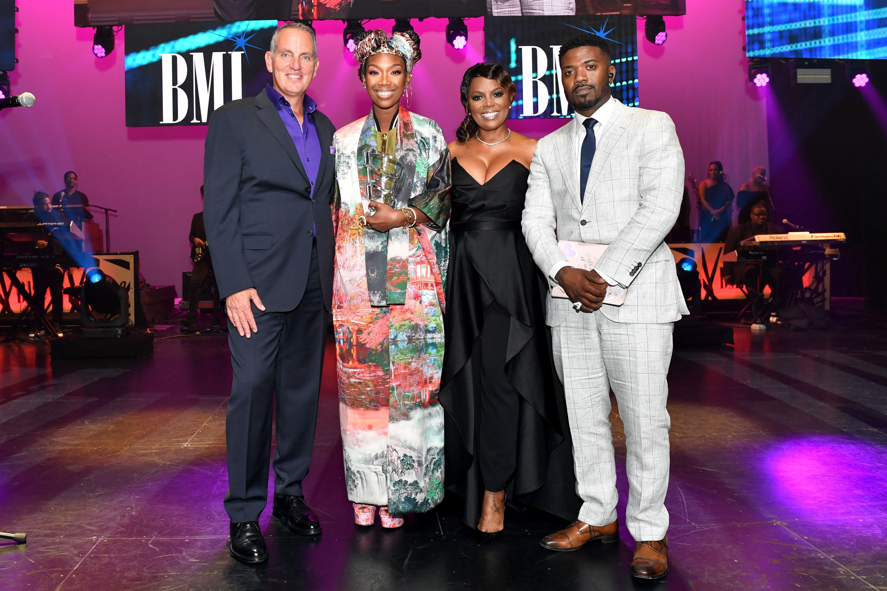 BMI President & CEO, Mike O’Neill, 2019 BMI President’s Award Recipient, Brandy Norwood, BMI Vice President of Creative Atlanta, Catherine Brewton, and Ray J pose onstage during The 2019 BMI R&B/Hip-Hop Awards at Sandy Springs Performing Arts Center on August 29, 2019 in Sandy Springs, Georgia.